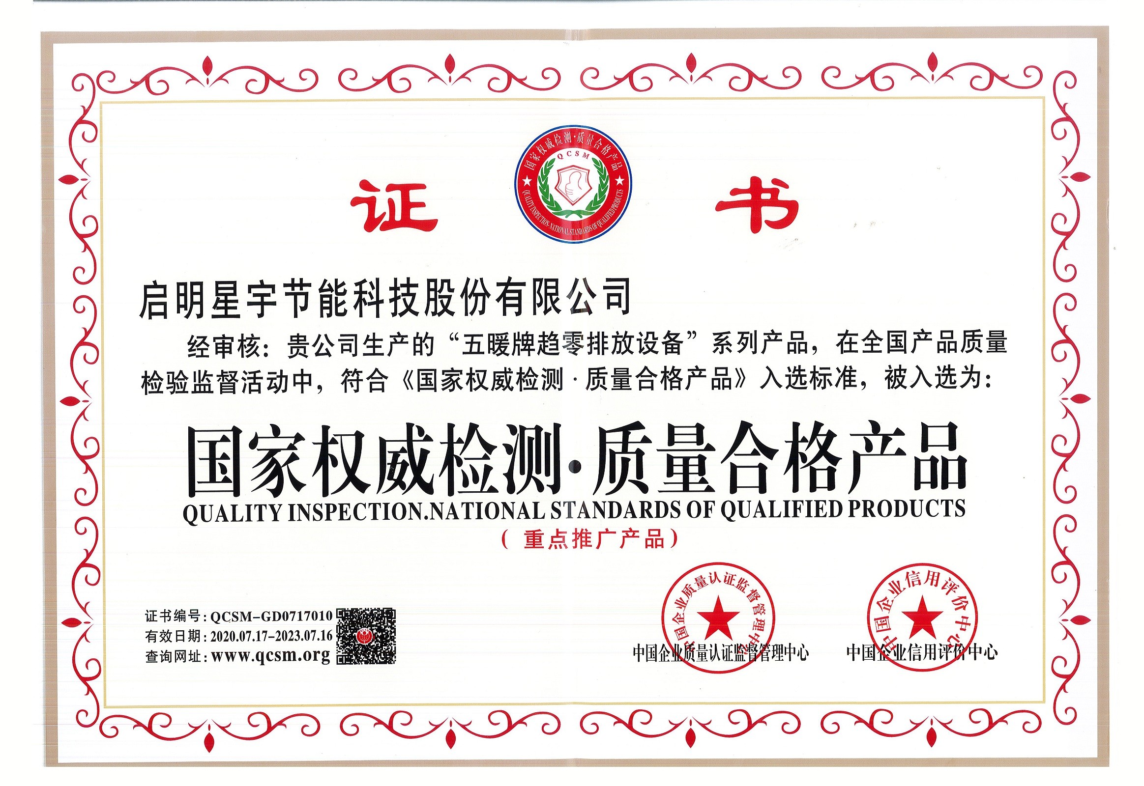 國家權威檢測質量合格產品證書